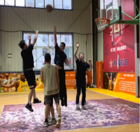 就这样,双方队员在球场上奋勇拼抢,挥洒汗水,再加上场外观众同事的助威呐喊,比赛进行得相当激烈。球场上,他们一会妙传,一会防守;时进时退,时缓时急;时而转身跳跃,时而三步上篮;时而个人精彩solo,时而团队巧妙协作,引得观众掌声阵阵,喝彩连连。“老年队”始终保持十分以上领先的优势。上半场,“老年队”暂时以50:35领先“青年队”。