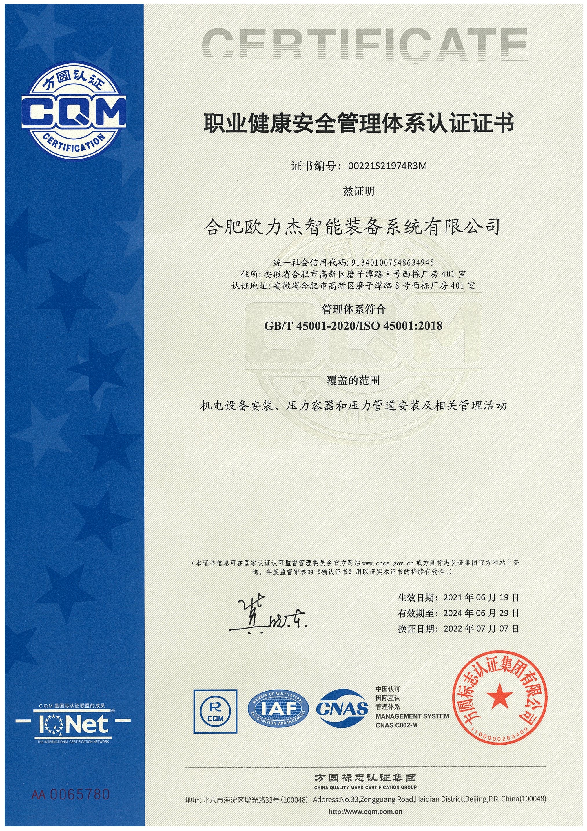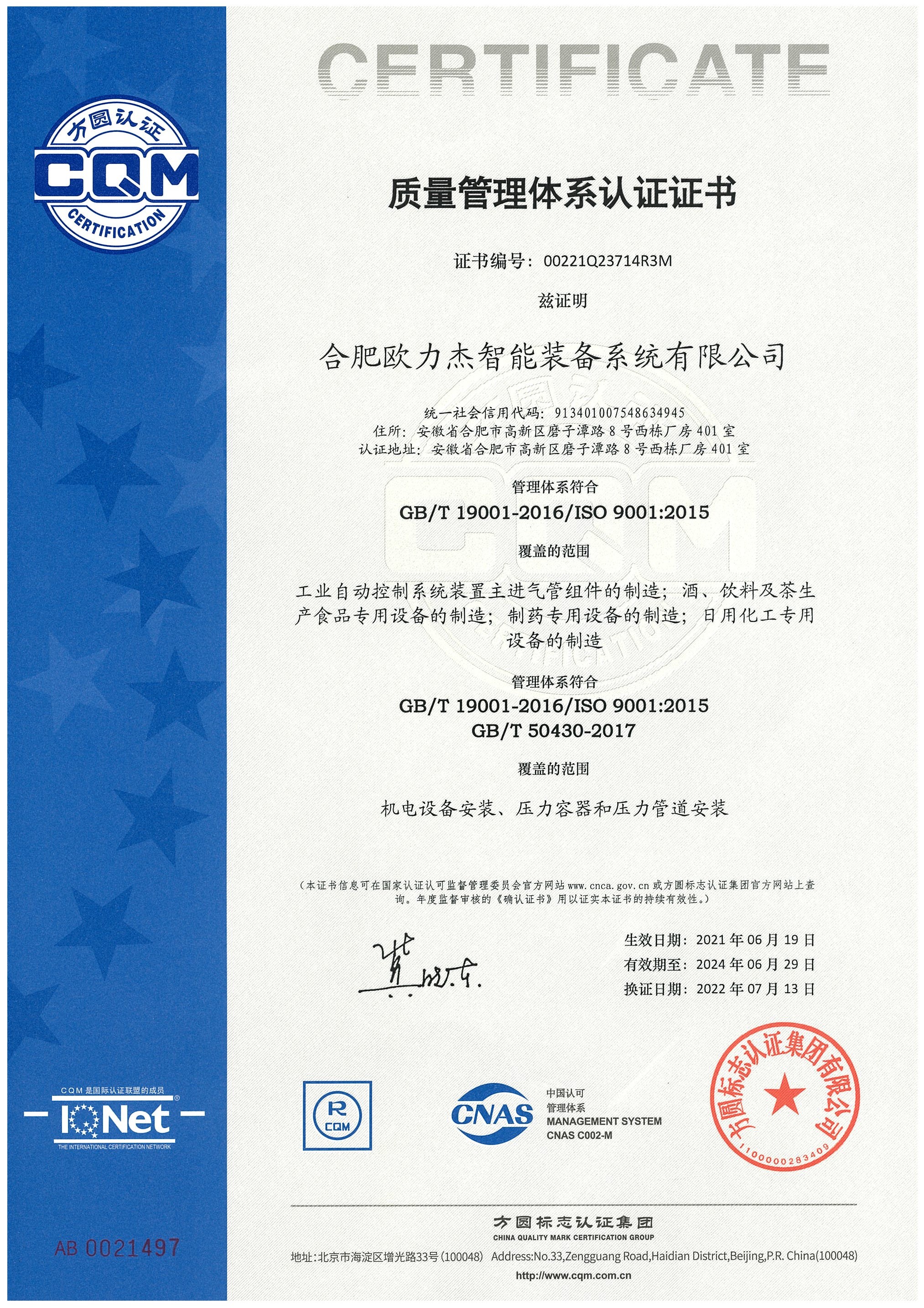 2022年7月1日-2日,公司对质量管理体系认证范围做了增项申报,方圆公司审核组专家李组长、张老师对增项范围进行了监督审核。此次认证范围增加了:工业自动控制系统装置主进气管组组件的制造;酒、饮料及茶生产食品专用设备的制造;制药专用设备的制造;日用化工专用设备的制造。为企业智能化装备与系统业务进一步深化助力。